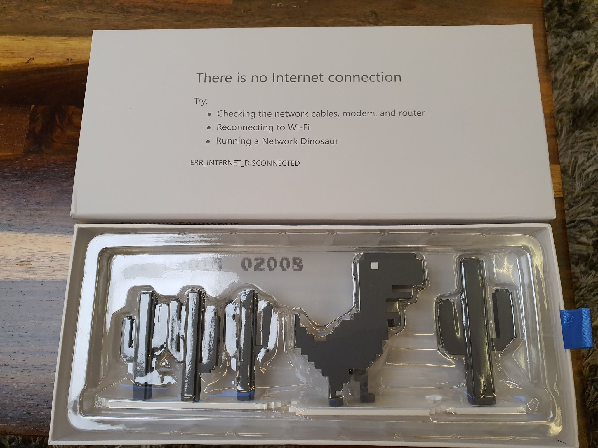 구글에서 인터넷 접속이 끊길 때 나오는 공룡, 그리고 나는 이 게임을 굉장히 잘하는 편이다. 에러창에서 스페이스바를 누르면 게임을 실행되는데, 인터넷이 접속중이 아닐 때 할 수 있는 간단한 미니게임이다. 모르는 사람들도 상당히 많지만, 아는 사람들은 다 아는 이 게임, 그리고 마스코트 공룡의 머천다이즈