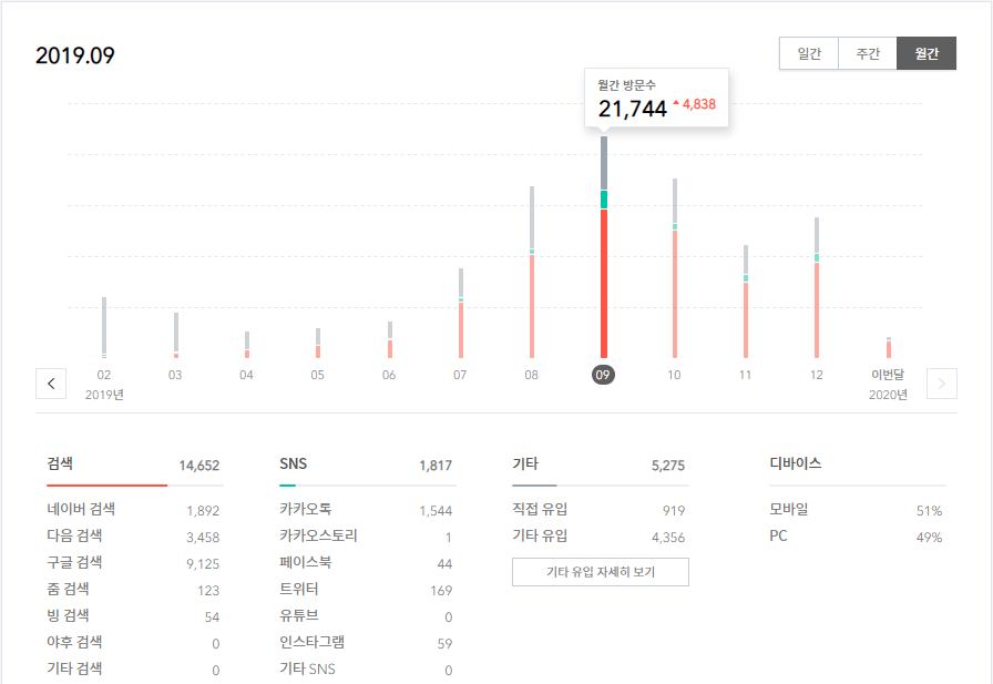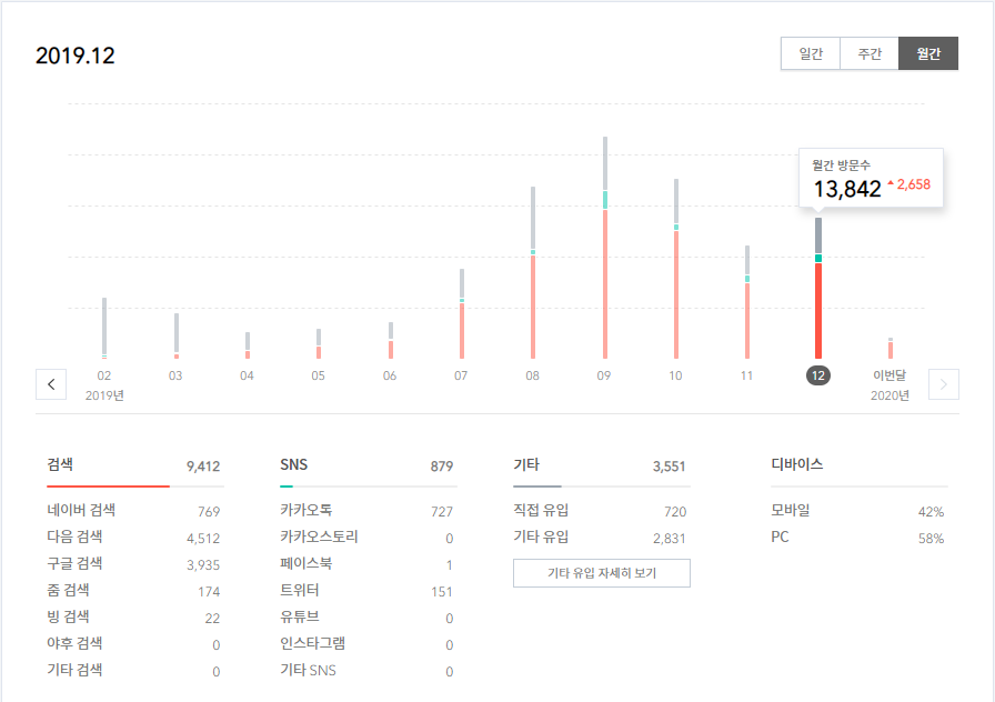 도메인을 변경하고 새로운 마음으로 전체적인 블로그의 디자인부터 방향까지 개편했고, 또 이 블로그는 저의 생각들을 정리해놓는 소중한 공간이다 보니, 하나하나 섬세하게 작업할 수밖에 없었습니다. 아무리 귀찮고 피곤하더라도 글의 끝맺음을 대충 지어놓진 않았습니다. 글이 글답게, 그리고 누군가에게 도움이 되고자 하는 글을 쓰려고 노력했습니다. 그리고 9월의 많은 방문자 수와 별개로 그다음에 점차 하락했지만, 12월부터 다시 방문자수가 증가하는 것을 확인할 수 있습니다.