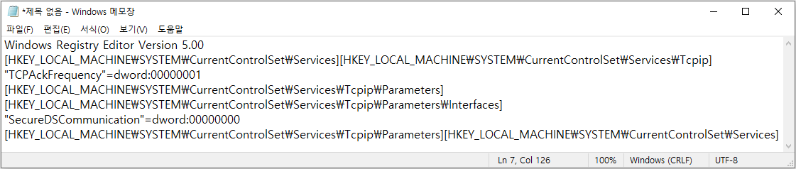 메모장을 연 후에 아래의 값을 메모장에 작성한 후, TCPNoDelay.reg로 변경하고 저장한 다음에 실행하면 됩니다.
