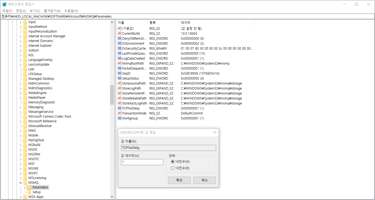 HKEY_LOCAL_MACHINEㅡSOFTWAREㅡMicrosoftㅡMSMQㅡParameters로 순서대로 클릭해야합니다.