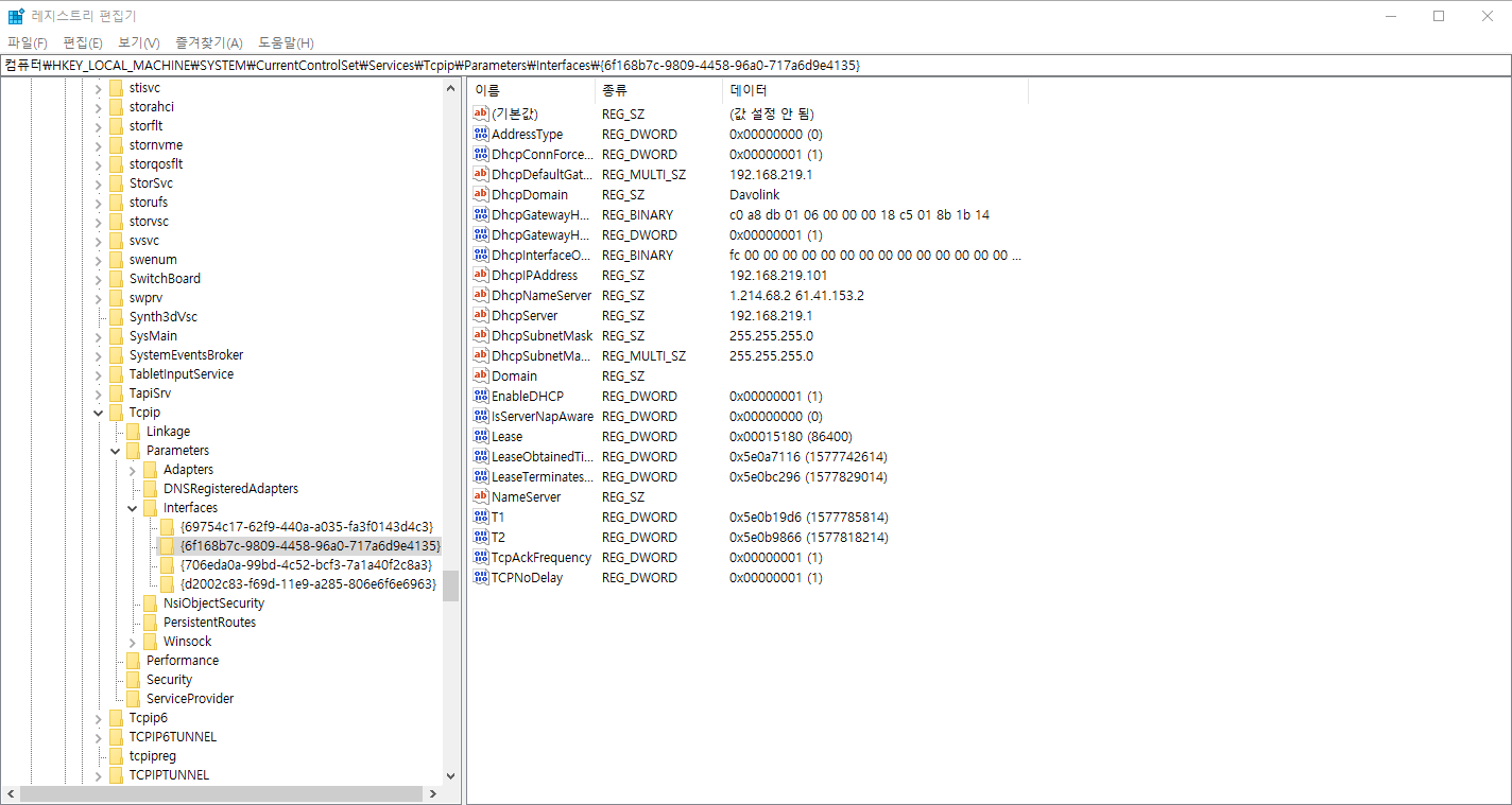 HKEY_LOCAL_MACHINEㅡSYSTEMㅡCurrentControlSetㅡservicesㅡTcpipㅡParametersㅡInterfaces로 순서대로 클릭해야합니다.