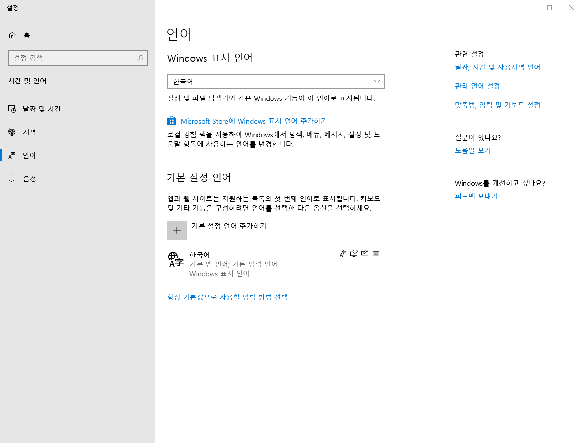 위와 같이 우측 하단에 보시면 영어키보드로 자동으로 전환되었다면 해당 옵션을 삭제해주어야 합니다. 내가 설치하지도 않았는데, 다른 프로그램을 실행하였거나 원하지 않는 이유로 설치되는 경우가 있습니다. 그래서 언어 기본 설정에서 아래와 같이 설정하세요.