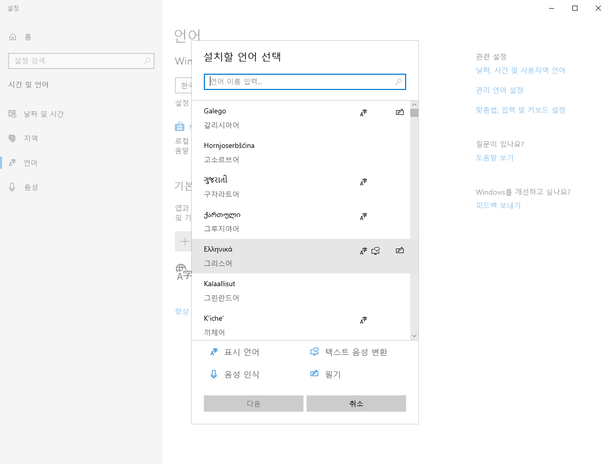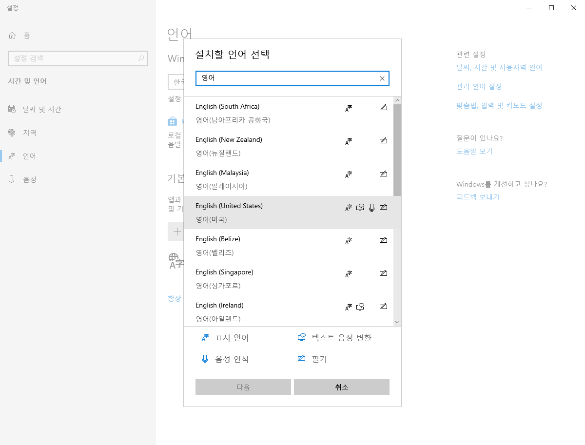 설치할 언어 선택에서 언어 이름 입력에 영어로 검색하면 영어 키보드를 추가할 수 있습니다.