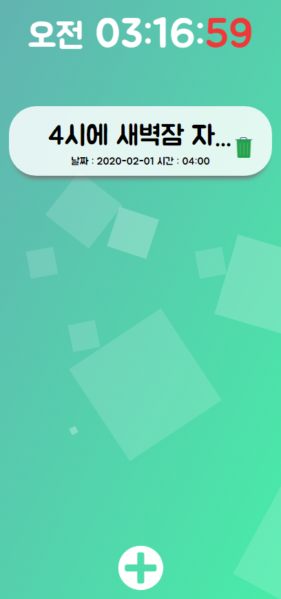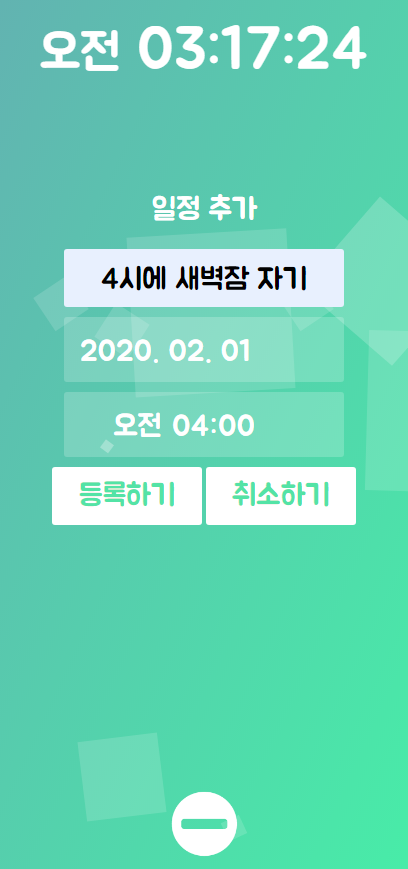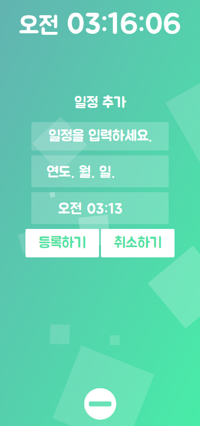 사용방법은 간단하다. 위와 같이 앱을 실행하면 일정알람을 바로 등록할 수 있다. 매우 직관적이다. 아래 버튼을 클릭하면 일정 추가를 할 수 있다. 일정을 입력해볼까?