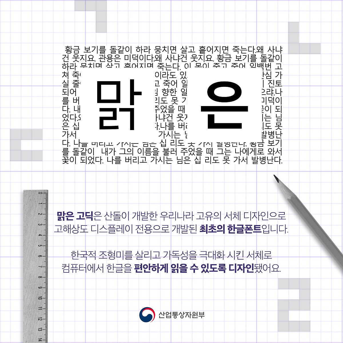 맑은 고딕, 글꼴 이름처럼 정말 맑다. 너무 맑아서 글씨에 군더더기가 없는 것 같다. 매일 쓰고, 보고 거의 모든 컴퓨터에 내장되어 있는 폰트라서 사람들이 그 가치를 잘 모르지만, 글꼴 크기 조절과 자간 정도만 조절하더라도 정말 아름다운 글씨체가 된다. 정말 다양한 한글글꼴을 써봤지만, 오히려 유료폰트보다 훨씬 좋다고 생각이 될 정도로 훌륭한 글꼴이다.