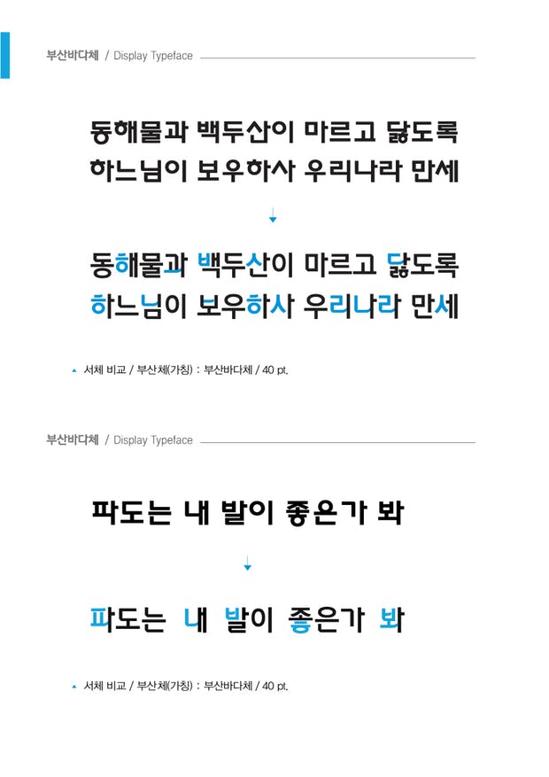 내가 좋아하는 폰트 중에 하나가 바로 부산바다체라는 폰트다. 일단, 역시 저작권 문제없이 사용할 수 있다는 점이 가장 좋고, 디자이너들을 위한, 디자인을 하기 위한 폰트라고 할 수도 있을 만큼, 미적으로도 우수하다. 일반 폰트보다 훨씬 세련되었다고 해야하나, 타이틀이나 중간 타이틀 혹은 서브글꼴로 사용하기에 너무 좋다.