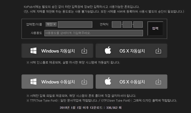 무료로 제공이 되지만 폰트를 다운 받을 때는 해당 사이트에서 개인(기업) 정보를 입력한 후 정확한 사용용도를 기입해야만 다운받아서 사용할 수 있다. 2019년 1월 1일 이후 다운로드는 약 33만회 이상을 다운받았다.