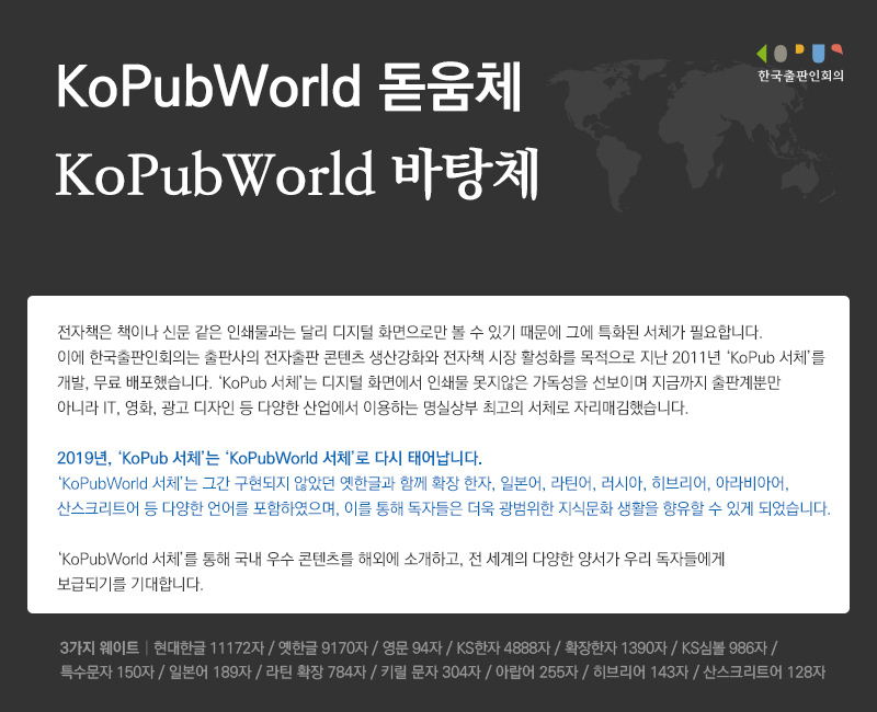 고딕체와 바탕체(명조체)로 나눠진다. 예전에는 코펍 2.0(KoPub2.0)이라고 해서 이전 버전밖에 없었는데, 훨씬 개선된 새로운 폰트, 코펍월드폰트가 개발되었다. 코펍 폰트는 그 이전에 구현되지 않았던 옛한글과 확장 한자, 일본어, 라틴어, 러시아, 히브리어, 아라비아어, 산스크리트어 등 다양한 언어를 포함했다. 그래서 다국어가 작성된 디자인 작업을 할 때 매우 유용한 폰트인 것이다. 역시 이럴 경우에는 뭐가 문제일까, 역시나 폰트가 무거워진다는 단점이 있다.