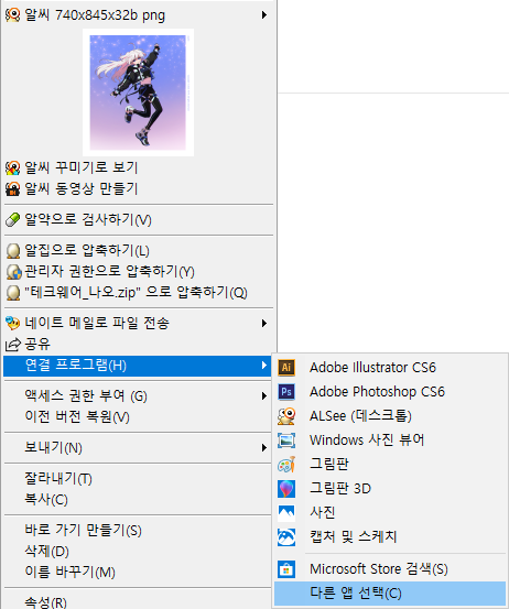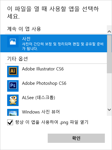 위와 같이 연결 프로그램을 다른 앱 선택을 클릭해서 이 파일을 열 때 사용할 앱을 선택하세요. 창에서 항상 이 앱을 사용하여 파일 열기를 체크하면 해당 확장자 파일을 열때, 내가 원하는 뷰어로 사진을 볼 수 있다. 하지만 이렇게 해도 컴퓨터를 재부팅하거나 하면 다시 알씨 뷰어로 되돌아가있는게 아닌가!