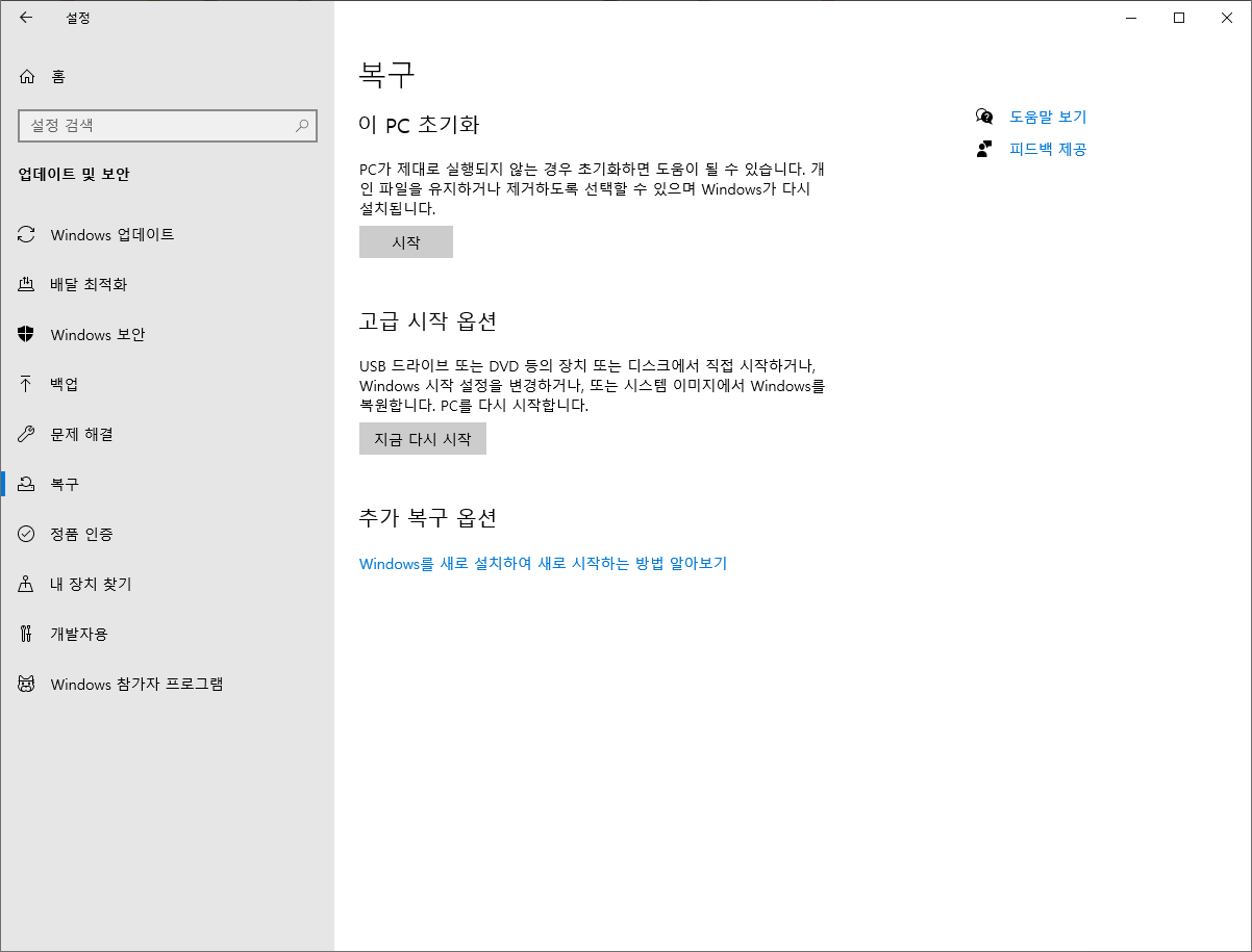 위와 같은 방법으로 해결해보고 안되면 역시, 가장 깔끔한 것은 윈도우 초기화를 하는 것이다.
