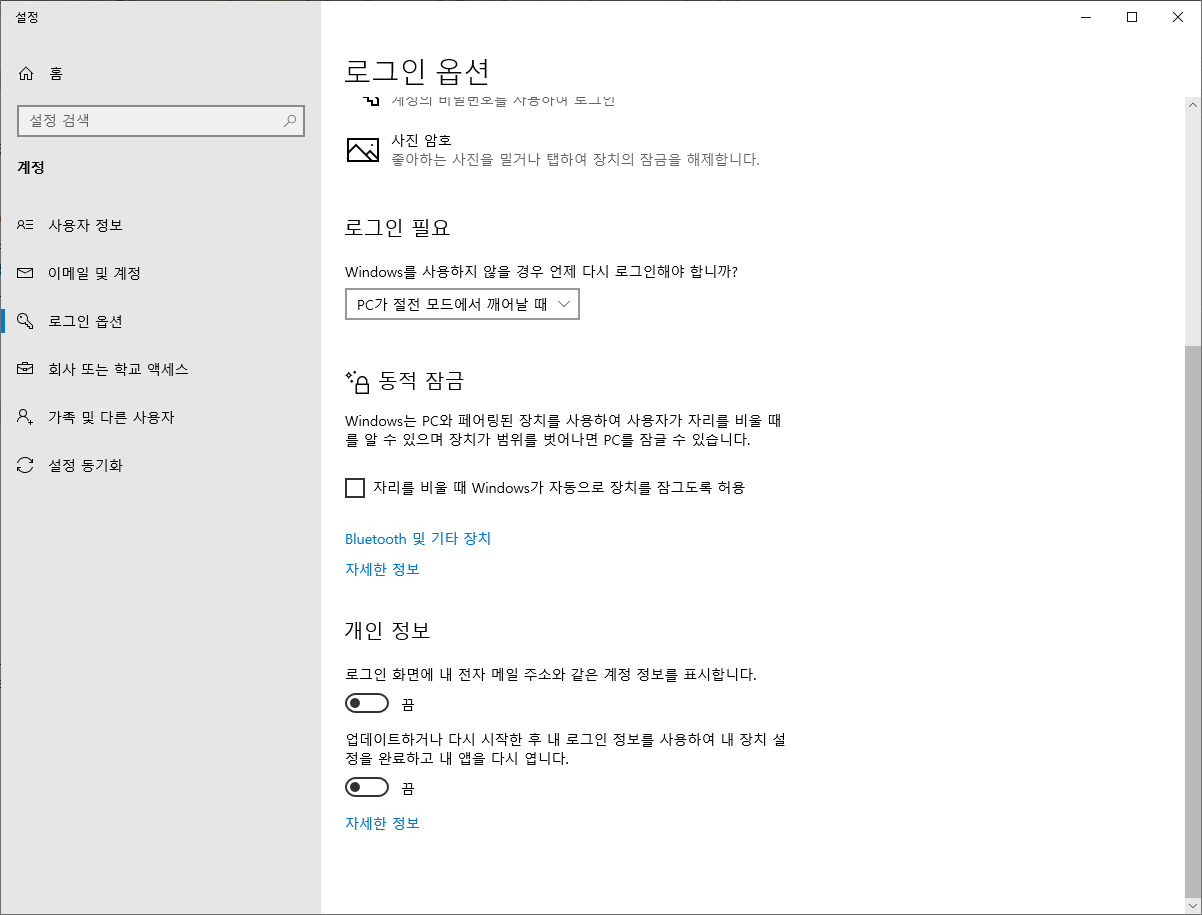 이런 경우에 로그인 화면에 계정 세부 정보 표시에서 저장옵션을 체크하는 부분을 확인할 수 있다. 이 속성창으로 이동해보자. 위의 속성을 클릭하면 아래와 같은 창이 뜬다.