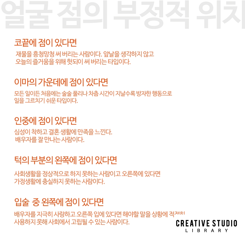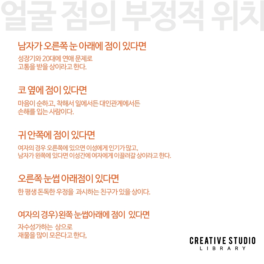 얼굴 점에 대한 다양한 이야기, 그 중에서 어떤 점이 얼굴에 있으면 어떤 의미를 가지는지 알아보는 시간입니다. 재미삼아 봐주시면 되고, 이게 정답은 아니니까, 오해하지 마시길 바랍니다. 그저 이런 것은 재미로만 봐도 충분하다고 생각합니다. 저도 점이 많은데, 조금 움찔하기는 하지만요. 나쁜 점은 빼는게 좋을지 고민이 되는 시간이네요!