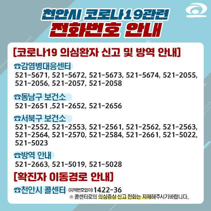 천안에서도 갑작스럽게 코로나바이러스로 인한 확진자가 급증하면서 천안시에서 급하게 관련 내용을 공지하고 있다. 만약에 코로나바이러스 의심이 간다면 위의 연락처로 꼭 연락해서 신고와 방역을 받을 수 있기를 바라고, 만약에 코로나바이러스가 걸렸다면 위의 안내로 연락을 꼭 하고, 확진자 이동경로에 대해서는 위의 천안시 콜센터를 통해서 안내받을 수 있다.