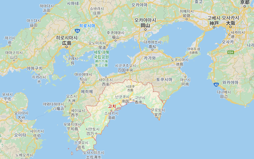 작품에 나오는 배경을 찾아보면 생각보다 더 작품을 이해하기 쉬워진다. 작품에서는 발견하지 못한 부분도 알 수 있고 말이다. 고치현은 교토와 그렇게 멀지 않다. 일본은 워낙 땅이 넓어서 비행기를 타고 이동하는 것이 편하다. 아래는 구글에서 제공하는 이미지를 캡쳐했다. 고치현에 대한 모습을 엿볼 수 있다.