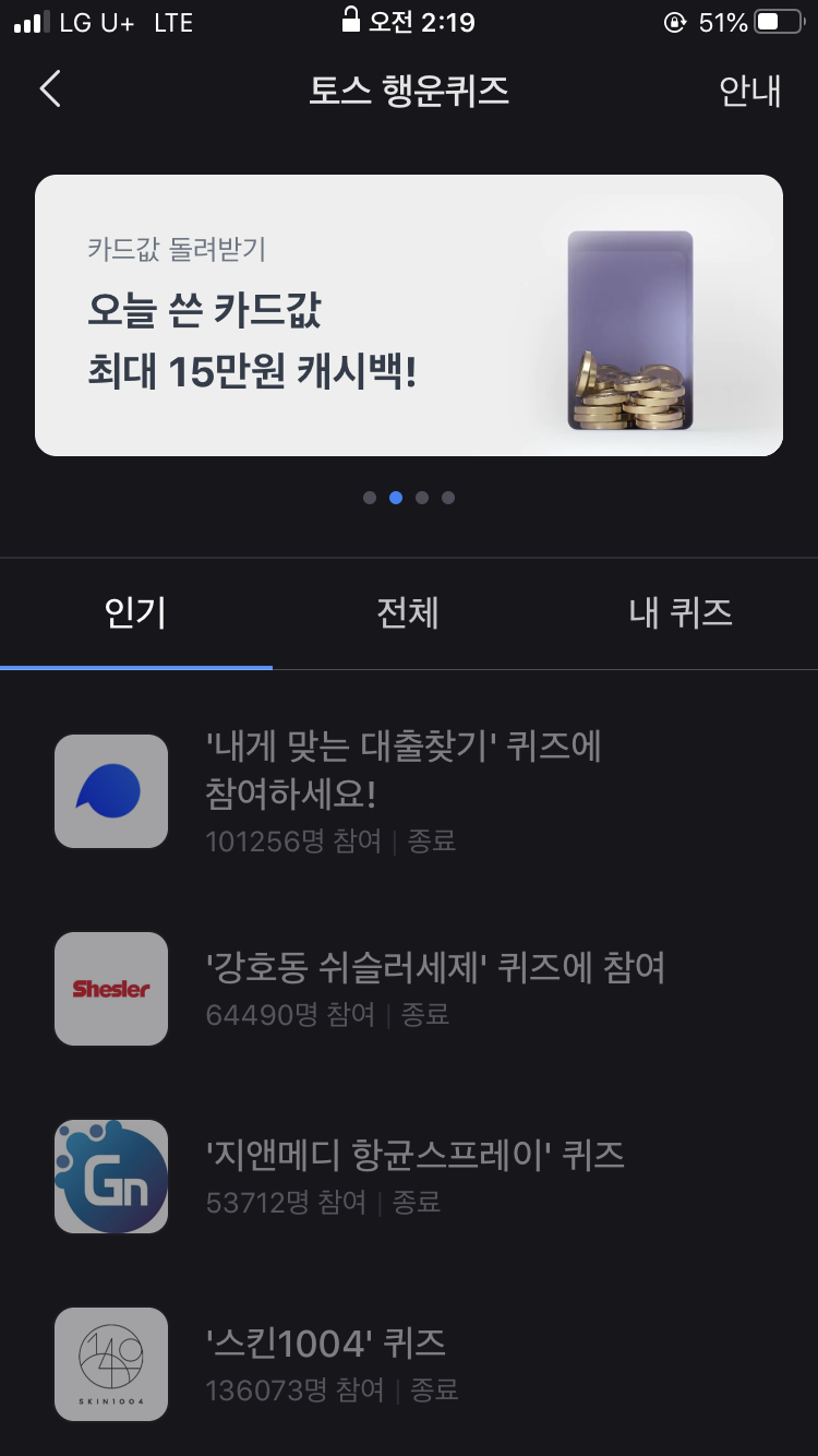 토스앱 초창기에는 많은 기능이 없었는데, 지금은 정말 많이 발전해서 다양한 기능을 제공하고 있습니다. 금융의 모든 것, 핀테크의 혁명인 토스는 정말 유익합니다. 예전에 행운퀴즈 이벤트때문에 네이버 실시간 검색을 장악해서 그게 좀 보기 싫었는데, 그래도 막상 토스앱을 쓰면 유익해서 정말 좋은 것 같습니다. 최근에는 다양한 앱을 직접 사용해보고 유용한 앱이 있다면 이렇게 소개해드리고 있습니다.