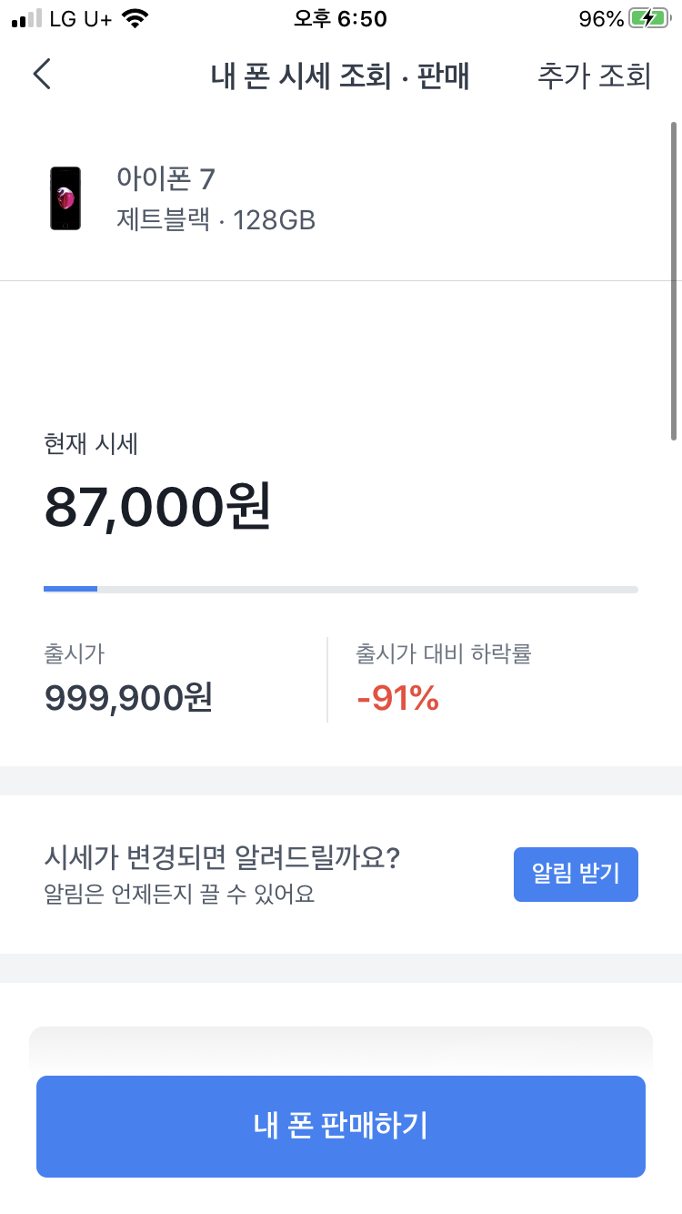 충격적인 아이폰 7 128G의 중고휴대폰 가격입니다. 출시가 999,900원(약 100만원)의 휴대폰이 무려 -91%의 시세를 보이고 있습니다. 아마 최근에 출시한 아이폰 SE때문일 것입니다. 아이폰 SE가 굉장히 귀엽고 콤팩트하게 잘 나왔는데, 저는 지금 사용하고 있는 아이폰을 매우 잘 사용하고 있고 또 오래 사용하고 있어서 당분간 휴대폰 교체 계획은 없습니다.