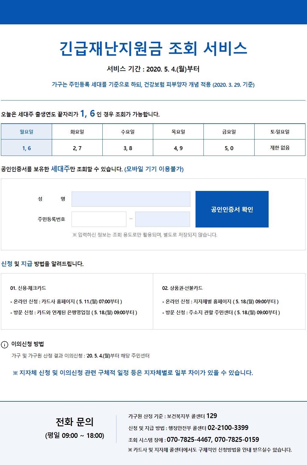 오늘부터 조회가 가능한 긴급재난지원금 조회 서비스 사이트다. 사이트 주소도 한글로 되어 있어서 매우 간단하지만, 들어가서 조회까지 해보고 깜짝 놀랐다. 일단 2부제로 운영되고 있어서 조회하는 것 조차도 요일별로 조회가 가능하다. 가구는 주민등록 세대를 기준으로 하되, 건강보험 피부양자 개념을 적용했다.