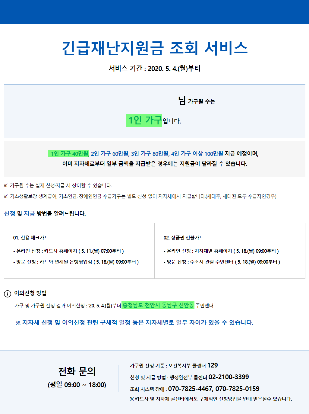 1인 가구인지 아지 미리 알고 있다면 굳이 조회할 필요도 없어보인다. 금액도 어차피 정해져있고, 신청 및 지급방법만 숙지하고 있으면 좋을 것 같다. 조회를 하면 내가 살고 있는 지역의 주민센터 정보가 나온다. 이의신청 방법을 통해 5월 4일부터 이의가 있는 사람들은 주민센터에 방문하면 된다.