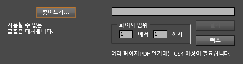 3) 스크립트를 실행시키면 불러오고자 하는 PDF를 실행시키면 됩니다. 페이지 범위는 직접 확인해서 입력해주시면 됩니다. CS4 이상 실행이 가능합니다. 이렇게 파일을 실행하면 정상적으로 여러개의 PDF 파일이 실행됩니다.