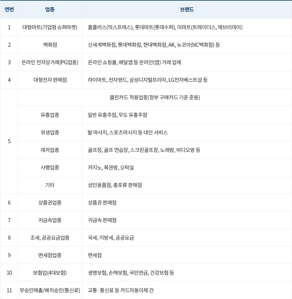 - 상세한 사용제한 업종(브랜드)는 해당 카드사 홈페이지 및 카드사 콜센터 문의(카드사별 업종분류 기준에 따라 다를 수 있음)