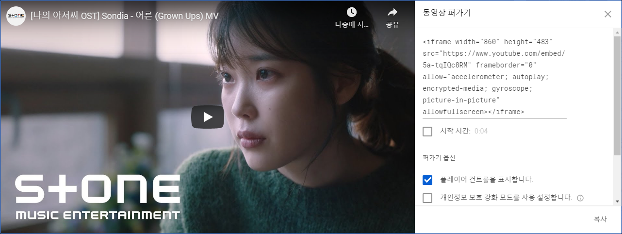 티스토리에서 유튜브 영상을 첨부할 때, 유튜브 링크를 첨부만 하면 되지만 가끔 회색 박스만 뜰 뿐 제대로 영상 소스를 불러오지 못하는 현상이 나타난다. 성격이 급한 나는 이러한 현상을 해결하기 위해서 여러가지를 해봤는데, 가장 쉬운 방법은 유튜브 영상의 공유버튼에서 소스를 긁어오는 방법이다. 이전부터 있는 방법이지만, 소스를 불러오면서 몇 가지 수정해줘야 하는 부분이 있다.