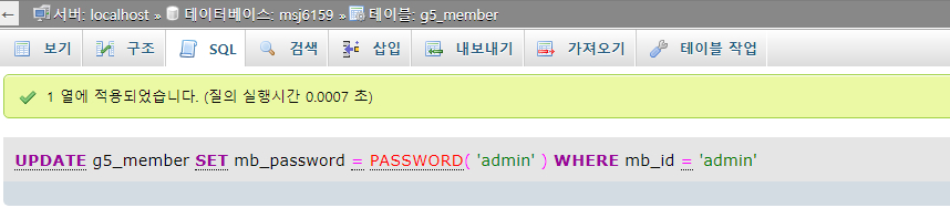 카페 24에서 제공하는 정보는 맞지 않기 때문에 위와 같은 방법으로 해결이 가능하다. 그누보드 5 기준으로 관리자 계정의 비밀번호를 변경하기 위해서는 해당 데이터베이스인 G5_member에서 SQL을 실행하여 아래와 같은 명령문을 작성해준다.