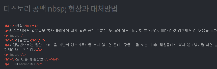 티스토리에서 외부글을 복사 붙여넣기 하게 되면 공백 부분이 Space가 아닌 로 표현된다. 아마 이걸 검색해서 이 내용을 보고 있는 분들은 때문에 고통받고 있을테니, 현상에 대해선 간단하게 정리한다.