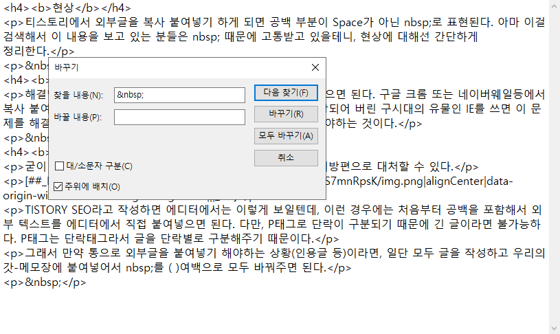 그래서 만약 통으로 외부글을 붙여넣기 해야하는 상황(인용글 등)이라면, 일단 모두 글을 작성하고 우리의 갓-메모장에 붙여넣어서 nbsp; 를 ( )여백으로 모두 바꿔주면 된다.