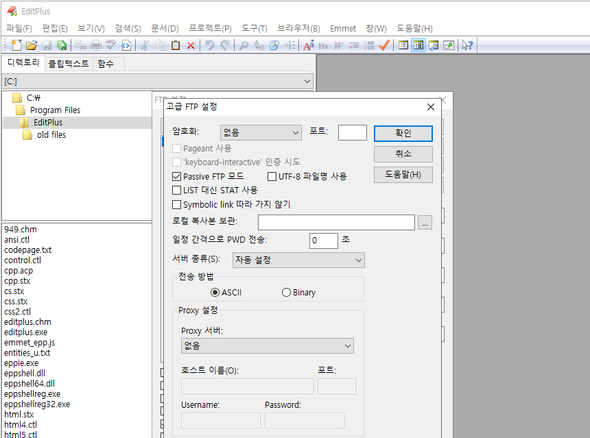 서버 종류는 자동으로 서버 종류를 판단하기 위해 자동 설정으로 선택합니다. 전송 방법은 ASCII 전송 방법을 선택하면 됩니다. 서로 다른 기종간에 파일 형식(CR/LF)을 자동으로 변환해주는데 비해, Bianry(바이너리)는 그렇지 않습니다. 일반적인 텍스트 파일이라면 최초 설정 그대로 두시면 됩니다.