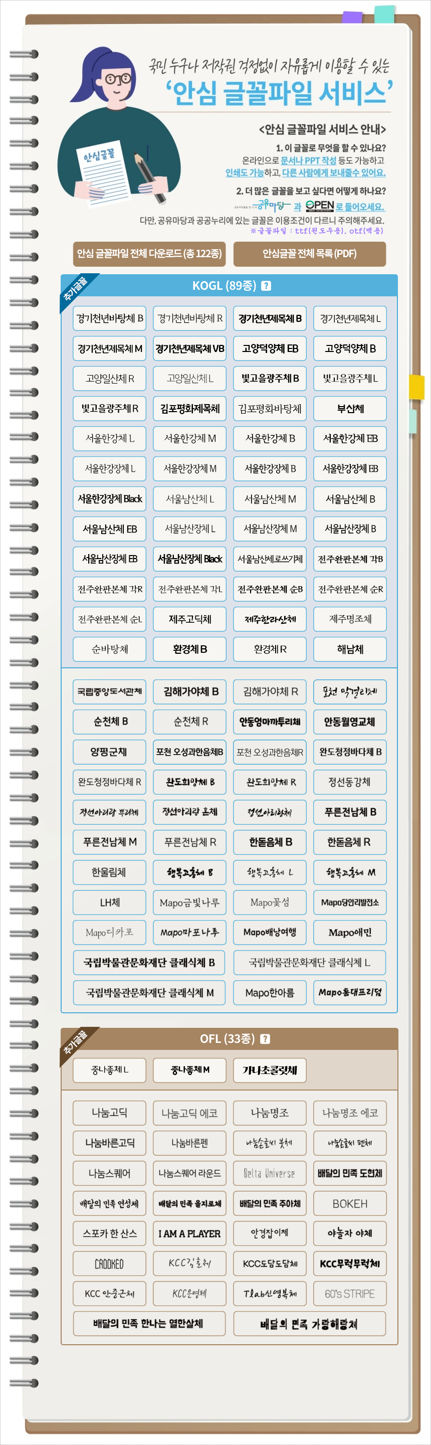 한글 무료폰트가 없다면 안심글꼴 파일서비스에 나와 있는 모든 폰트를 다운받을 수 있다. 압축파일을 다운 받아 한 번에 압축을 해제하고 검색창에 확장자로 검색하면 한 번에 설치가 가능하다. 무료로 저작권 걱정없이 사용할 수 있는 폰트만 모아놓은 자료다. 공유마당에서 서비스하고 있으며, 업로드 용량 관계로 공식 사이트에서 직접 다운 받을 수 있다.