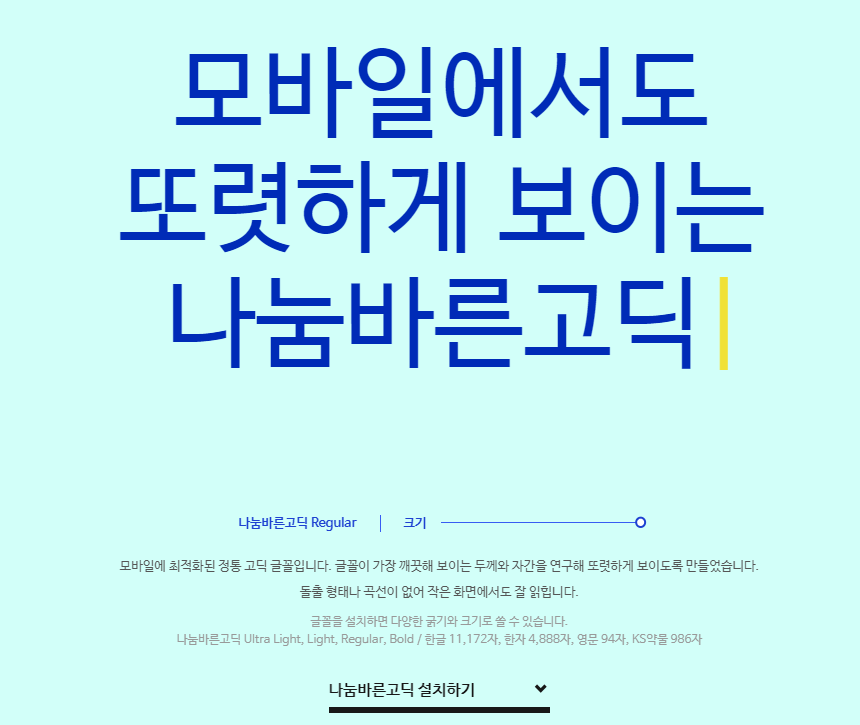 나눔바른고딕 Ultra Light, Light, Regular, Bold / 한글 11,172자, 한자 4,888자, 영문 94자, KS약물 986자
