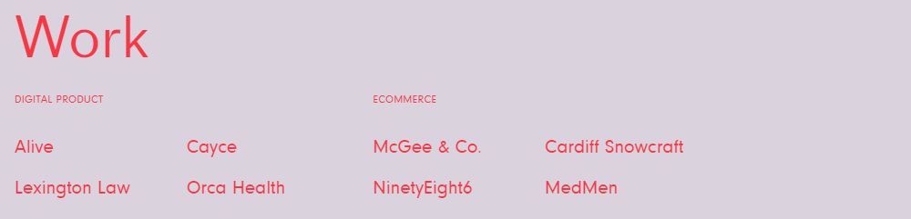 메뉴바의 모습에서도 텍스트만으로도 레이아웃 디자인을 통해 직관적으로 이동할 수 있게 되어 있습니다. 심플하면서도 매우 효과적으로 디자인이 되어 있는 디자인 스튜디오의 레퍼런스 자료입니다.