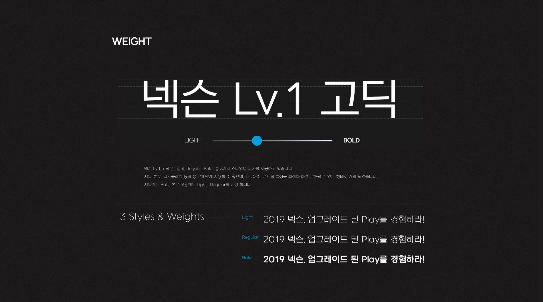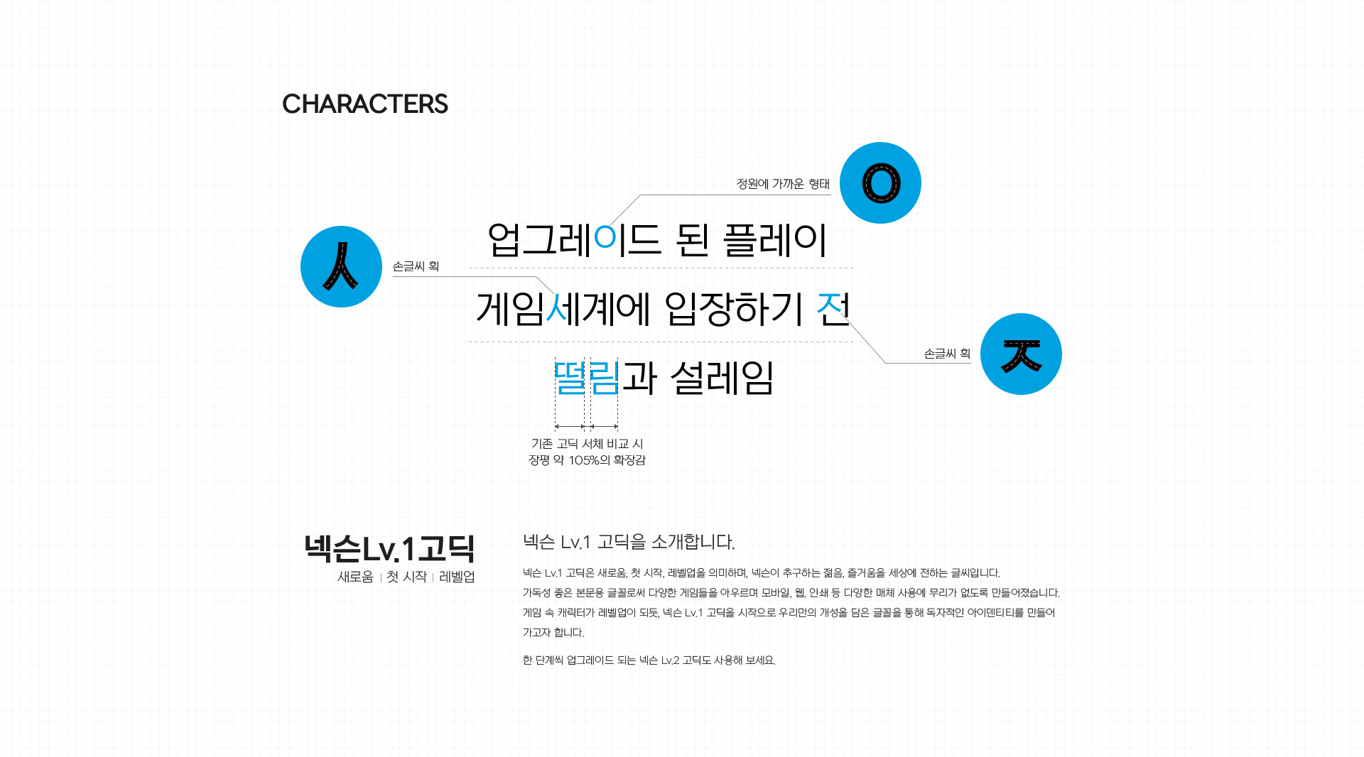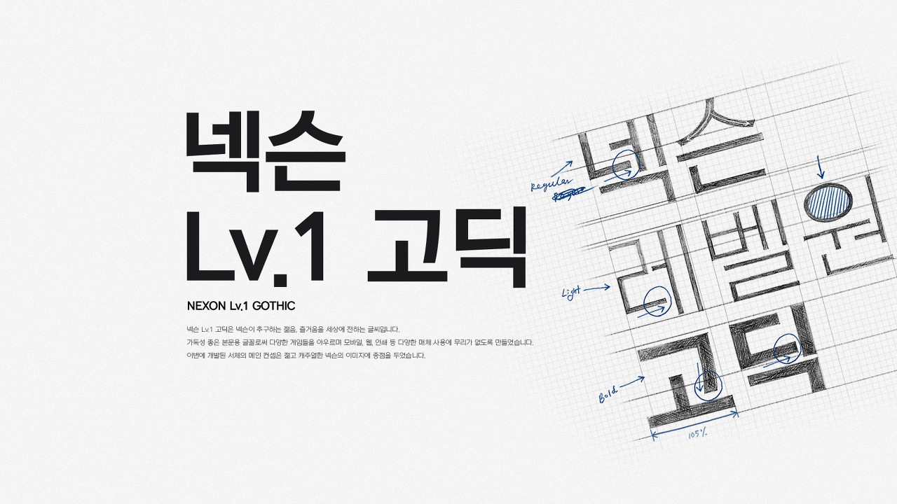 넥슨 Lv.1 고딕은 새로움, 첫 시작, 레벨업을 의미하며, 넥슨이 추구하는 젊음, 즐거움을 세상에 전하는 글씨입니다. 가독성 좋은 본문용 글꼴로써 다양한 게임들을 아우르며 모바일, 웹, 인쇄 등 다양한 매체 사용에 무리가 없도록 만들어졌습니다. 게임 속 캐릭터가 레벨업이 되듯, 넥슨 Lv.1 고딕을 시작으로 우리만의 개성을 담은 글꼴을 통해 독자적인 아이덴티티를 만들어 가고자 합니다. 한 단계씩 업그레이드 되는 넥슨 Lv.2 고딕도 사용해 보세요.
