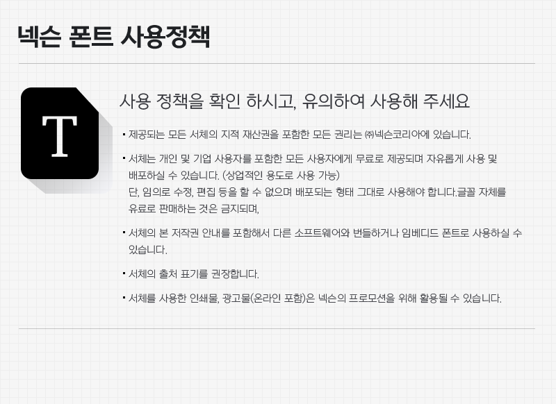 - 넥슨LV고딕을 본문용으로 사용할 경우 행간은 1.4배 이상으로 설정하는 것을 권장합니다.