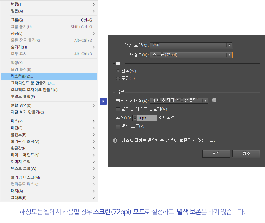 래스터화를 클릭한 후 래스터화 옵션은 스크린 모드로 설정하고, 앤티 앨리어싱(A)은 아트 최적화(수퍼샘플링)으로 적용합니다. 그리고 별색 보조는 체크하지 않습니다. 이 설정만으로도 사진 이미지의 용량이 매우 작아집니다. 이를 통해 일러스트 파일 용량을 크게 줄일 수 있습니다.