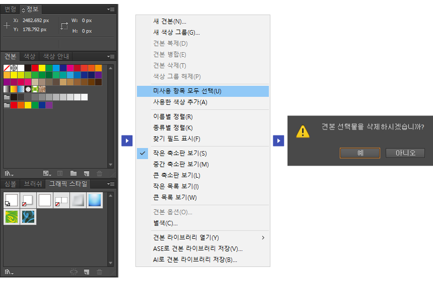 2) 불필요한 견본 색상(스와치) 또는 브러쉬 및 심볼 제거
