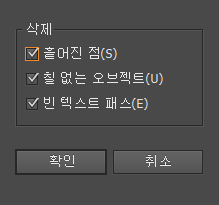 이렇게 편리한 기능이 있는데, 이것만으로도 파일 내의 용량이 상당히 줄어들고 훨씬 가벼워지는 느낌을 받을 수 있습니다. 다양한 이유로 숨어있는 패스나 텍스트가 없는 빈 패스 등 디자인에 영향을 주지 않지만 불필요한 요소가 있는 것들을 일괄 제거할 수 있습니다.