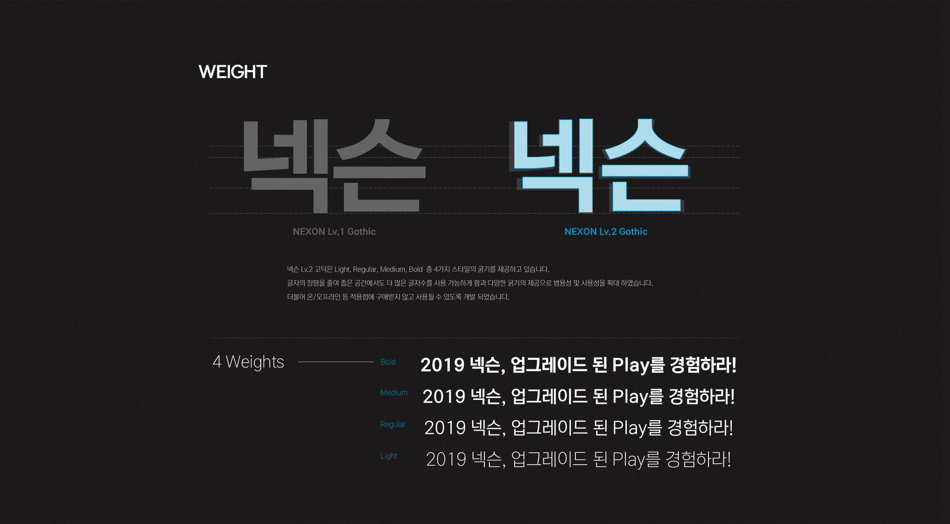 넥슨 고딕은 레벨 1과 레벨 2로 나눠져 있습니다. 장평(글의 가로길이)가 짧은 것이 넥슨 고딕 Lv2입니다. 개인적으로는 레벨 2가 더 웹폰트에 적합하고 예쁘다고 생각하고 있습니다. 넥슨 고딕 레벨 1도 예쁘지만, 타이틀에 더 적합하다고 생각합니다.
