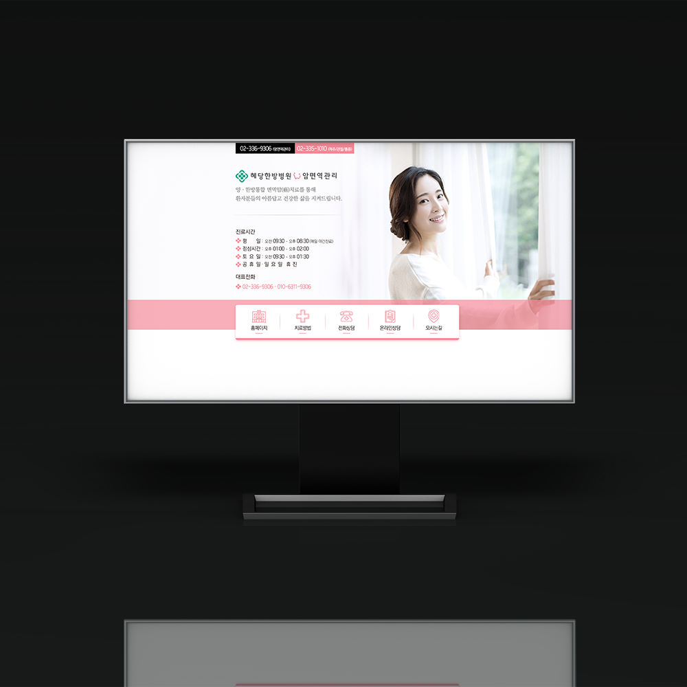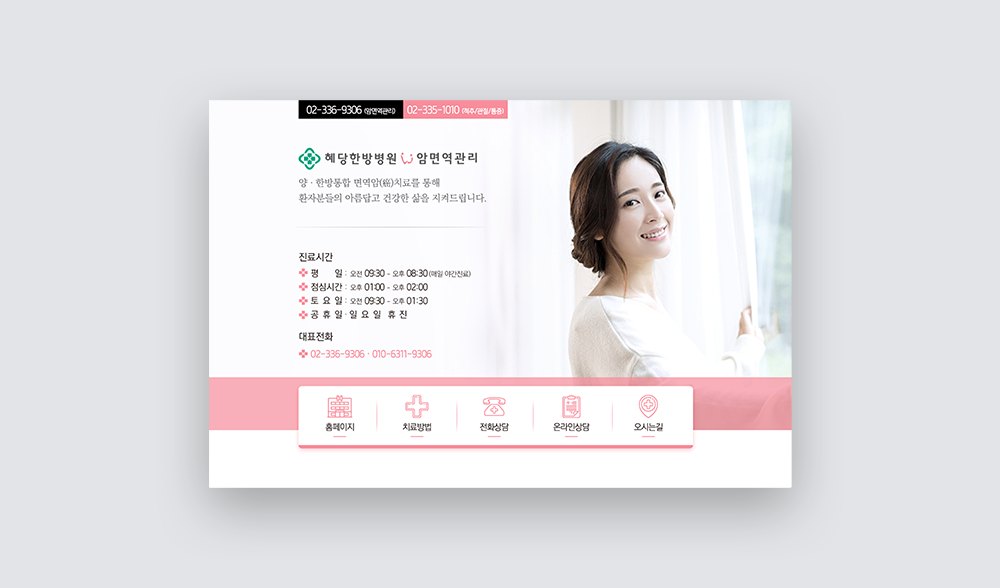 빠른 제작기간, 여성스러우면서도 따뜻한 느낌의 디자인, 심플하면서 기존에 충실한 디자인, 직접 이미지 등을 활용하여 제작하기를 원하셨습니다. 혜당한방병원 홈페이지를 참고하여 관련 요소들을 찾았습니다. 로고 이미지의 경우에는 더 크게 제작하고 싶었으나, 원본 이미지의 경우(Png 이미지파일) 벡터 이미지 파일이 아니여서 화질 저하를 우려해 원본 사이즈 그대로 사용하였습니다.