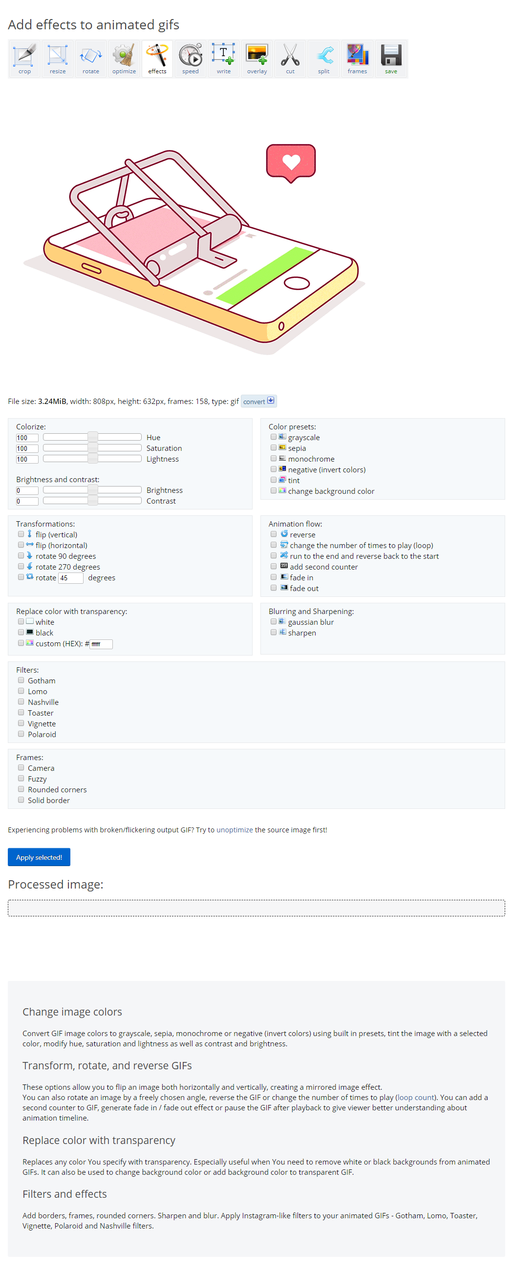 Add effects and modify animated GIF images online. Rotate, reverse, flip, convert GIFs to grayscale or sepia. Change hue, saturation and lightness values. Add second counter and change loop count.