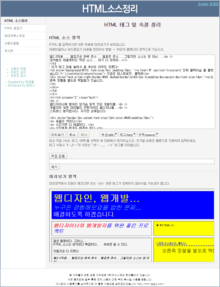 별도로 설정할 것은 없고 정리하고자 하는 HTML 태그 소스를 복사하여 위 사이트에 붙여넣기 한 후 제거하고자 하는 속성을 선택 후 적용하면 말끔하게 정리가 됩니다.