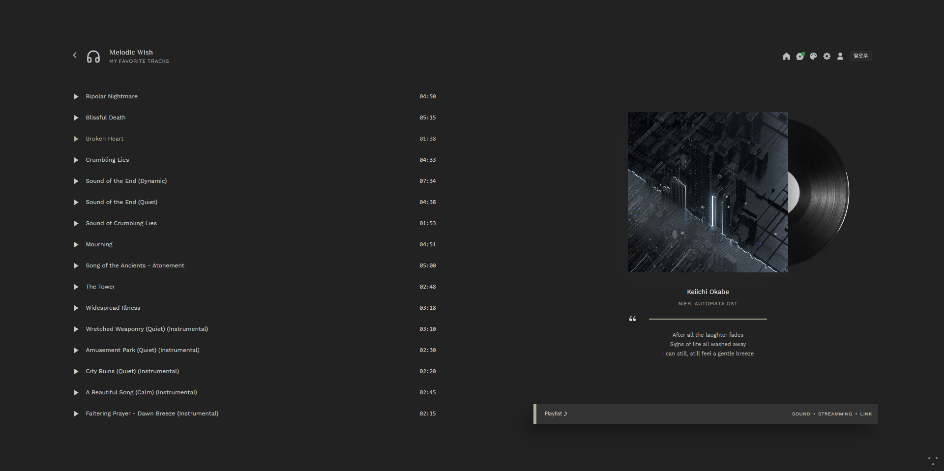 좋아하는 음악들을 모아 두고 플레이하기 위해 만든 텀블러 블로그 디자인입니다. 플레이리스트는 드롭박스 링크를 활용하여 연동이 가능하고 우측 하단에 링크를 통해서 다른 곳으로 이동할 수 있게 되어 있습니다. 활용하기에 따라서 추가적으로 연동할 수 있는 기능들이 더 있을 텐데, 다른 작업들이 많아 아직 연동까지는 못했습니다.