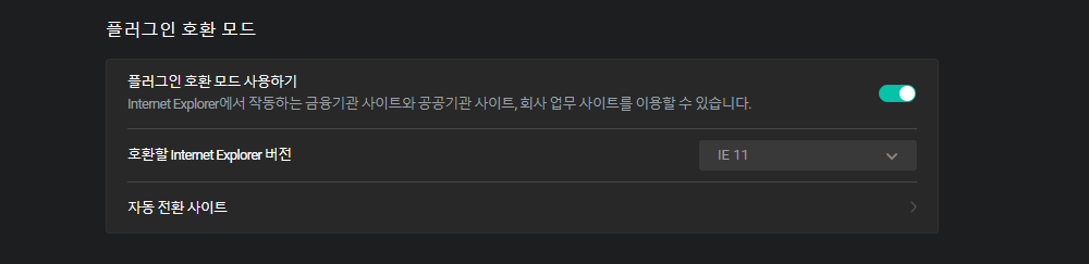 네이버 웨일의 경우에는 브라우저 옵션에서 플러그인 호환 모드에서 플러그인 호환 모드 사용하기를 체크하시면 홈택스 뿐만 아니라 금융기관 사이트, 공공기관 사이트 등에 접속이 가능합니다. 자동으로 호환 체크가 안된다면 아래 항목에 있는 자동 전환 사이트에 홈택스 사이트를 추가하시면 됩니다.