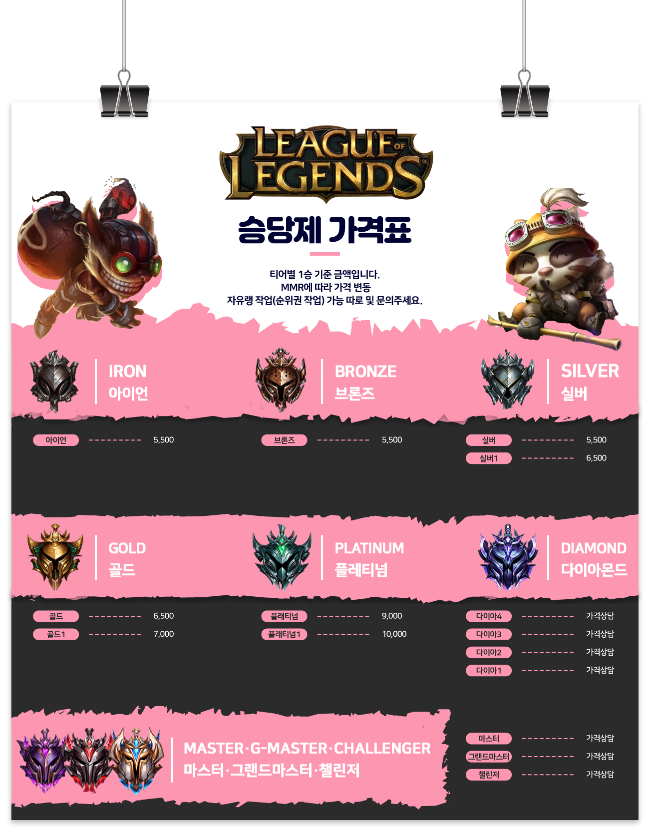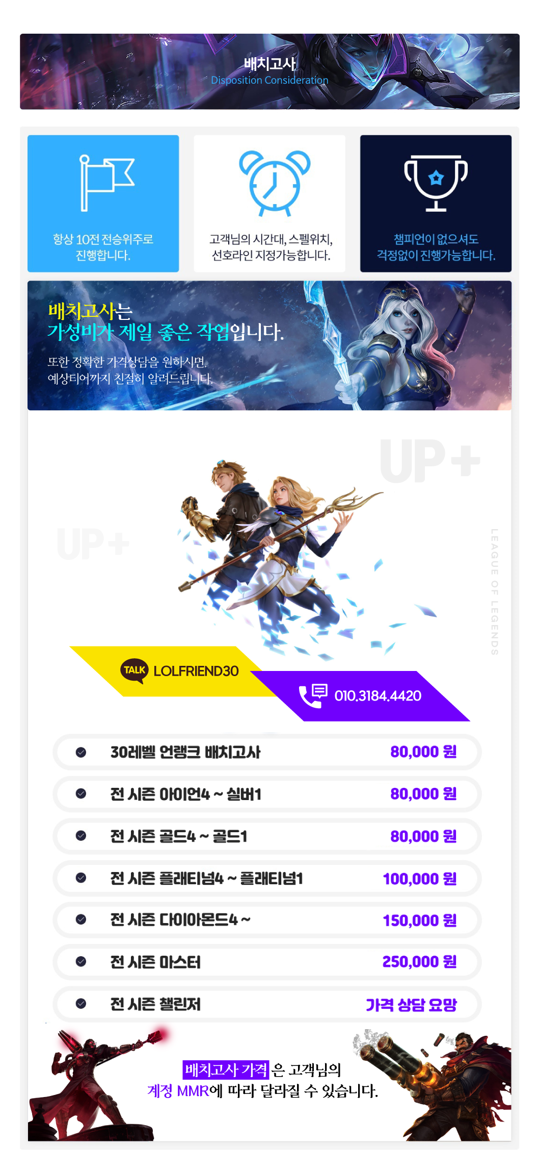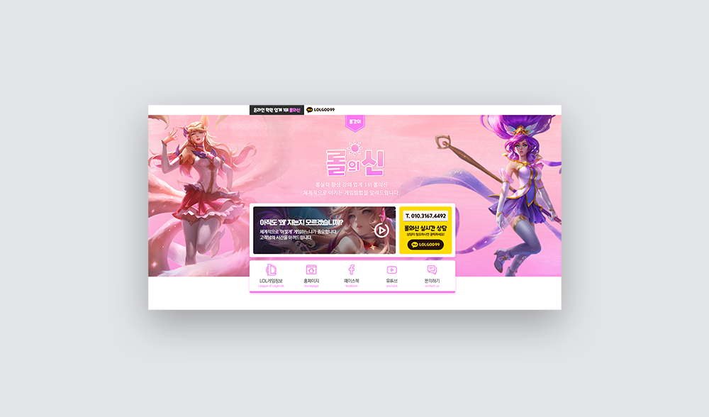 이러한 디자인 들을 참고하여 롤 친구 홈페이지형 블로그 디자인을 작업하였습니다. 각 섹션이 구분되게 제작하였으며, 누끼 이미지들을 활용하여 제작하였습니다. 이외에 여러 롤 친구, 롤의 신 게임 관련 업체의 디자인 작업들을 진행했습니다.