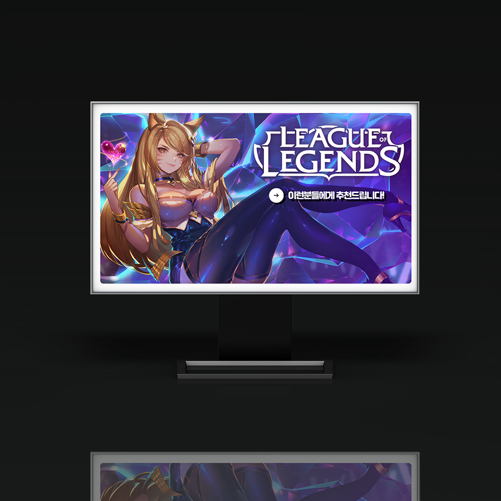 각 섹션마다 심플하게 구성되어 있던 부분들을 리디자인 하였습니다. 롤 관련 캐릭터 누끼 이미지를 삽입하였고, 그러데이션이나 각 하이라이트 부분에 타이틀 텍스트를 삽입하였습니다. 훨씬 다채롭고 각 섹션이 구분되도록 디자인 작업을 하였습니다.