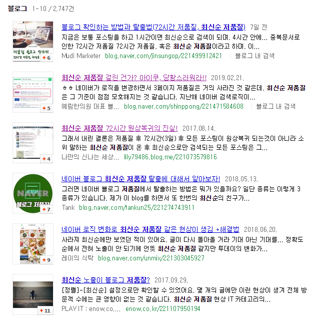저품질 현상은 두 가지가 있다. 하나는 모든 게시물의 순위가 3페이지 외로 밀려나는 3페이지 저품질이 있고, 모든 게시글이 아예 노출이 안되고 최신순으로만 검색했을 때 노출되는 최신순 저품질이 있다. 3페이지 저품질보다는 최신순 저품질이 그나마 다시 원상복구 될 확률이 높은 것인데, 왜냐하면 이것이 오류로 발생하는 것이기 때문이다.