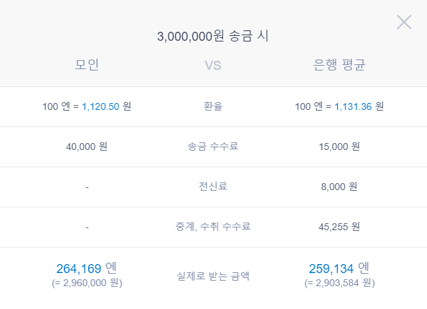 3,000,000원을 송금한다고 했을 때(실시간 환율에 따라 금액은 변동될 수 있음) 시중 은행보다 모인이 훨씬 저렴한 것을 확인할 수 있었다. 전신료와 중계, 수취수수료가 발생하기 때문이다. 그리고 추천인은 등록했을 때 쿠폰을 지급받을 수 있기 때문에 쿠폰을 사용하면 보통 5,000원 정도 수수료 할인이 된다.