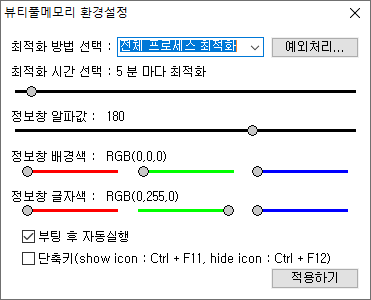 자동 최적화를 누르면 환경설정에서 설정한 시간 마다 자동으로 최적화 하는 기능입니다.