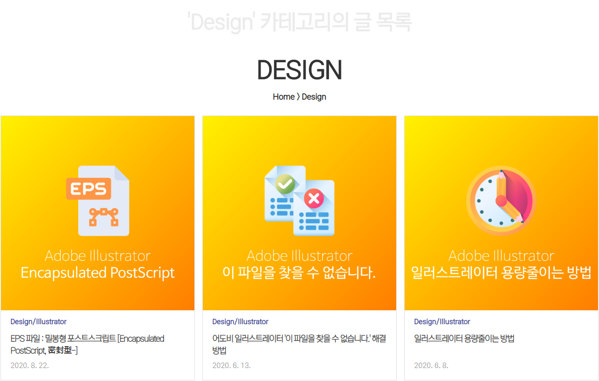 카테고리 리스트 페이지 부분에서 위와 같이 사이트를 구조적으로 만들었습니다. 홈은 랜딩페이지로 이동하고 디자인은 현재 보여지고 있는 카테고리의 주소를 나타냅니다. 티스토리에서 제공되는 치환자인 티스토리 이동경로·카테고리 경로(Breadcrumb navigation) 적용를 활용하여 현재 페이지의 타이틀을 가져오고, <s_list>치환자를 활용하여 를 적용한 모습입니다.