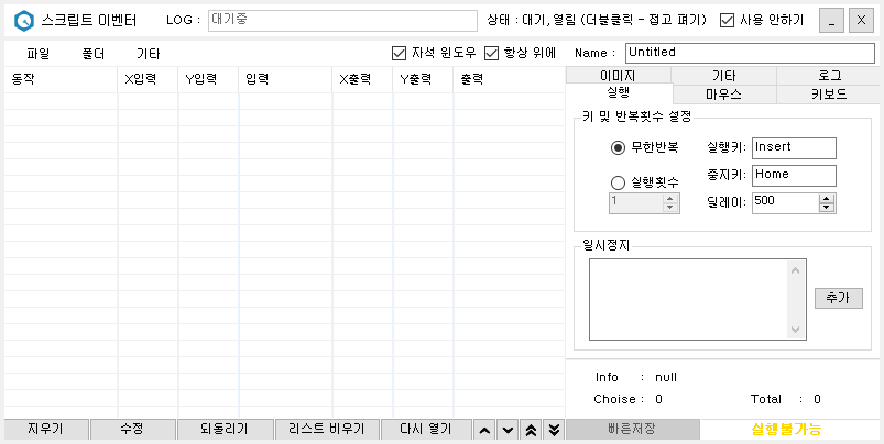 실행키와 중지키를 설정할 수 있고, 실행 회수도 따로 설정이 가능하며 딜레이 추가가 가능하다. 캡처의 경우에는 좌표값으로도 해당 기능 내에서 세팅이 가능하다. 복잡한 스크립트의 경우에는 설명문이 필요하여 주석처리 기능이 추가되었다. 이미지 서치의 경우에는 색상값이 변경될 경우, 인식이 안될 수 있으므로 이 점은 별도로 고려해야 한다.